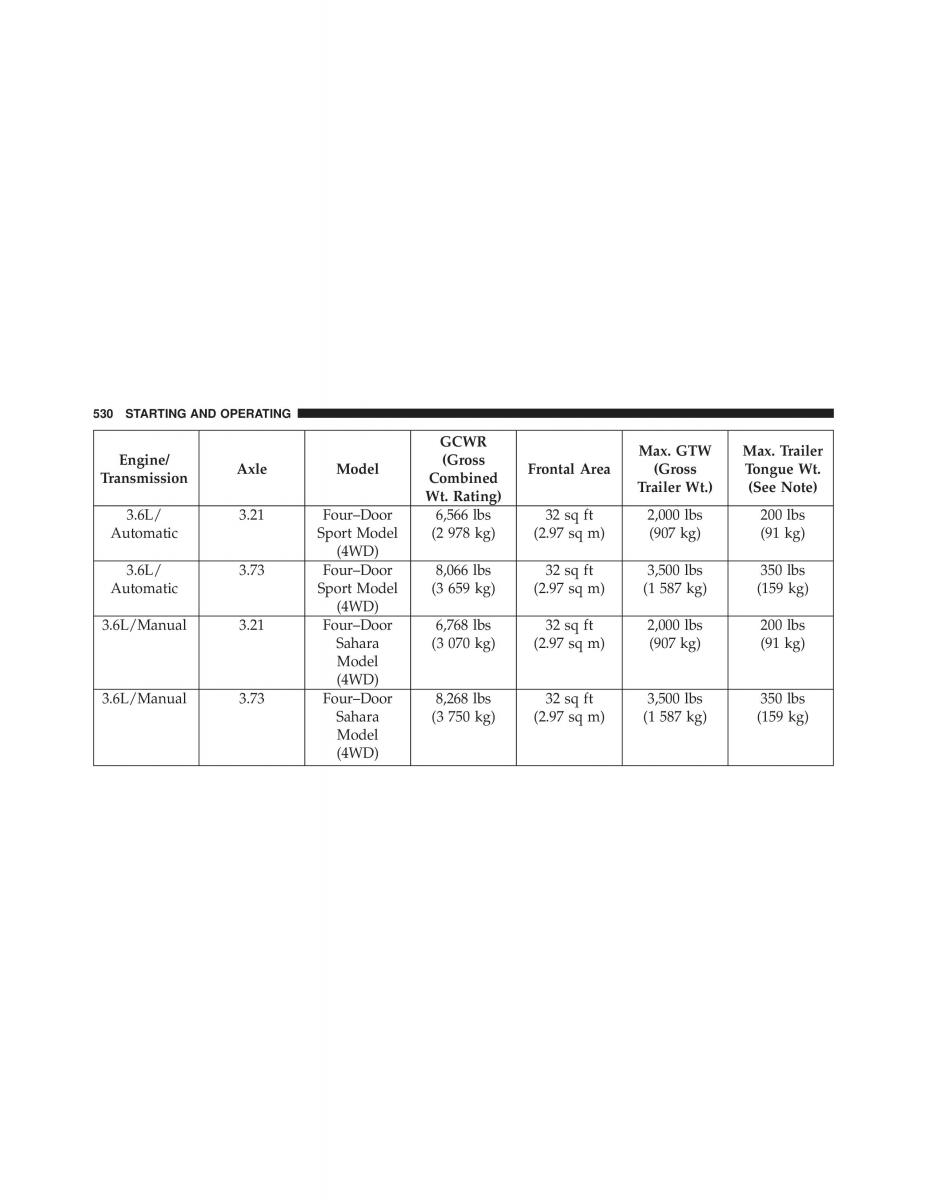 3.6L/Manual 3.73 Four–Door 8,268 lbs 32 sq ft 3,500 lbs 350 lbs