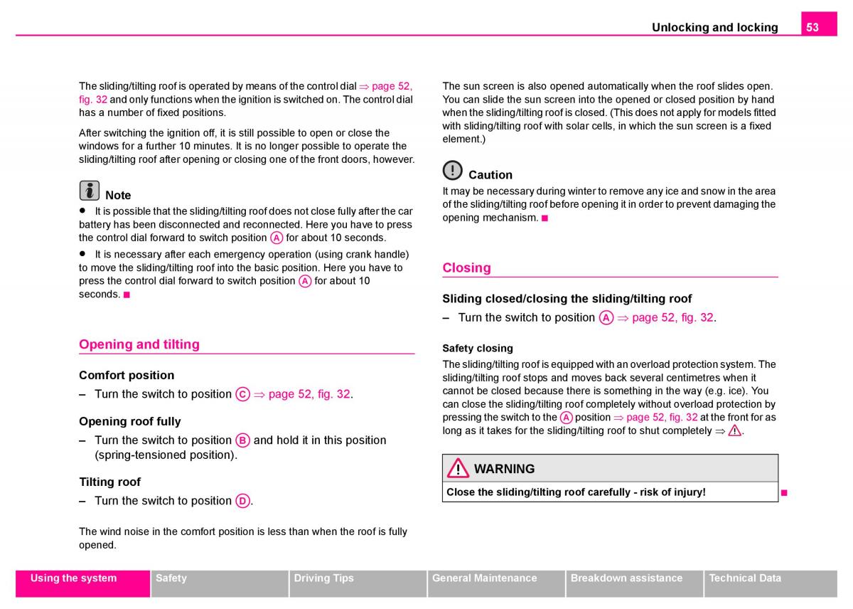 – Turn the switch to position ⇒ page 52, fig. 32. can close the sliding/tilting roof completely without overload protection by