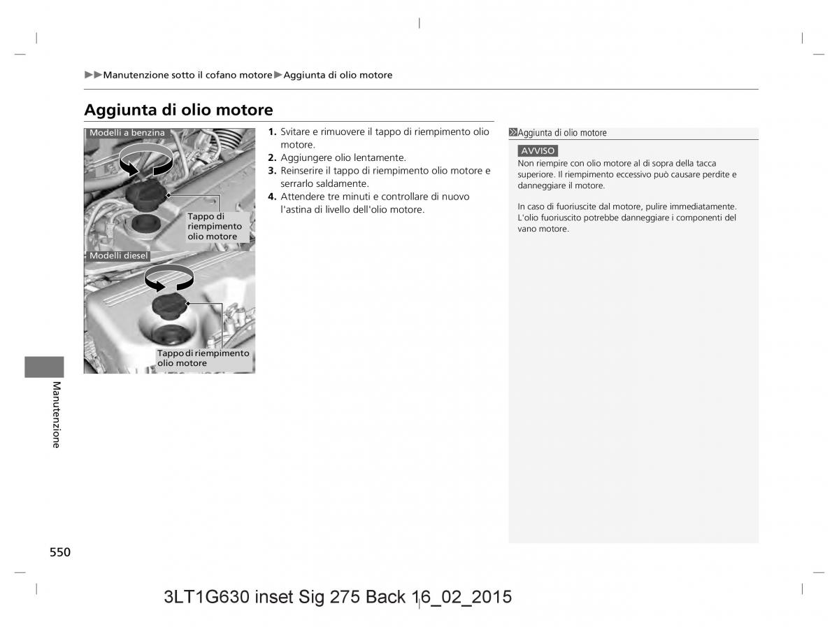 3. Reinserire il tappo di riempimento olio motore e superiore. Il riempimento eccessivo può causare perdite e