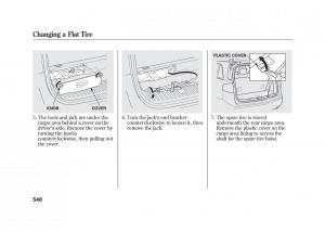 16. Put on the spare tire. Put the 20. Place the flat tire face up under the