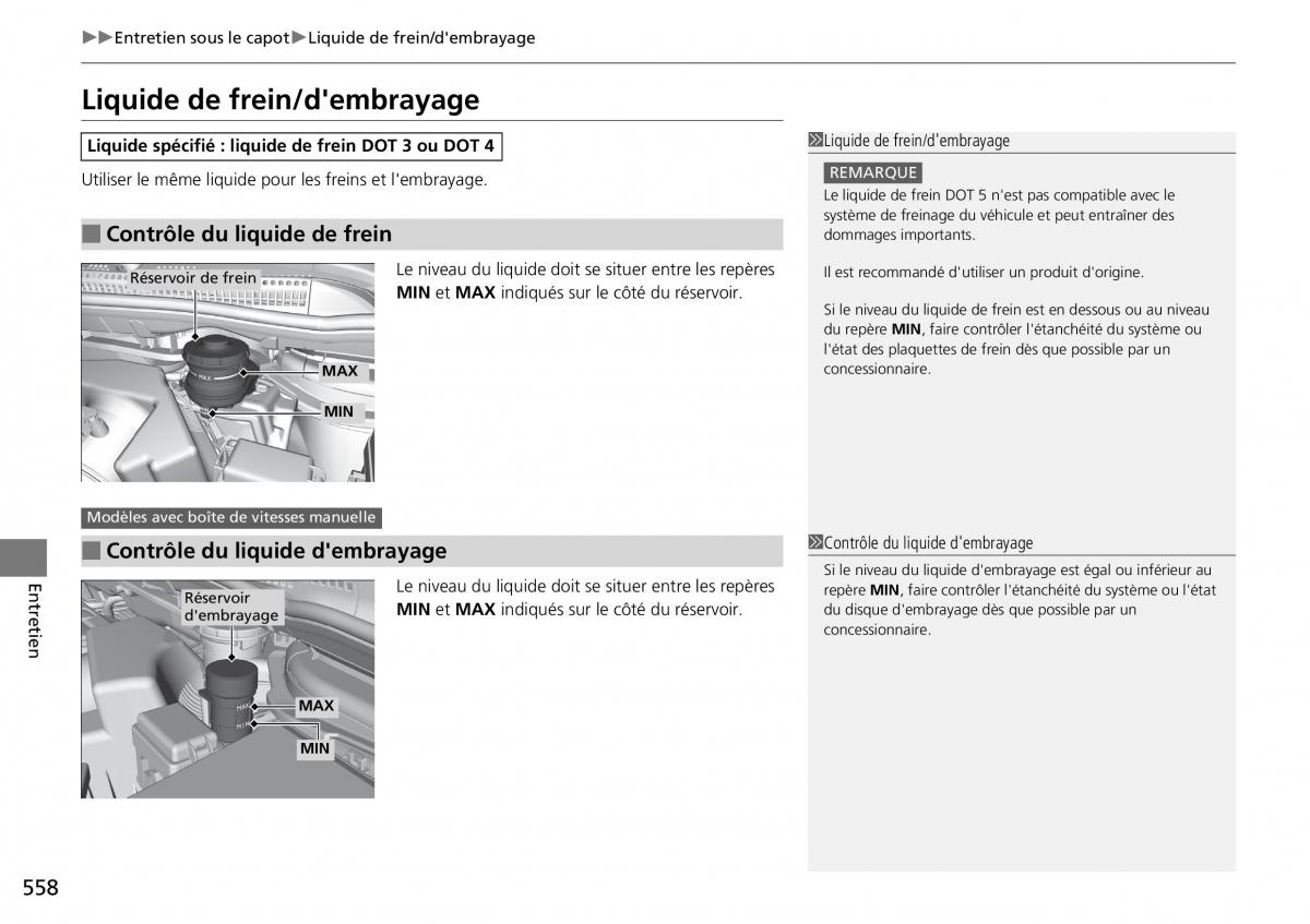 Entretien Réservoir Le niveau du liquide doit se situer entre les repères repère MIN, faire contrôler l'étanchéité du système ou l'état