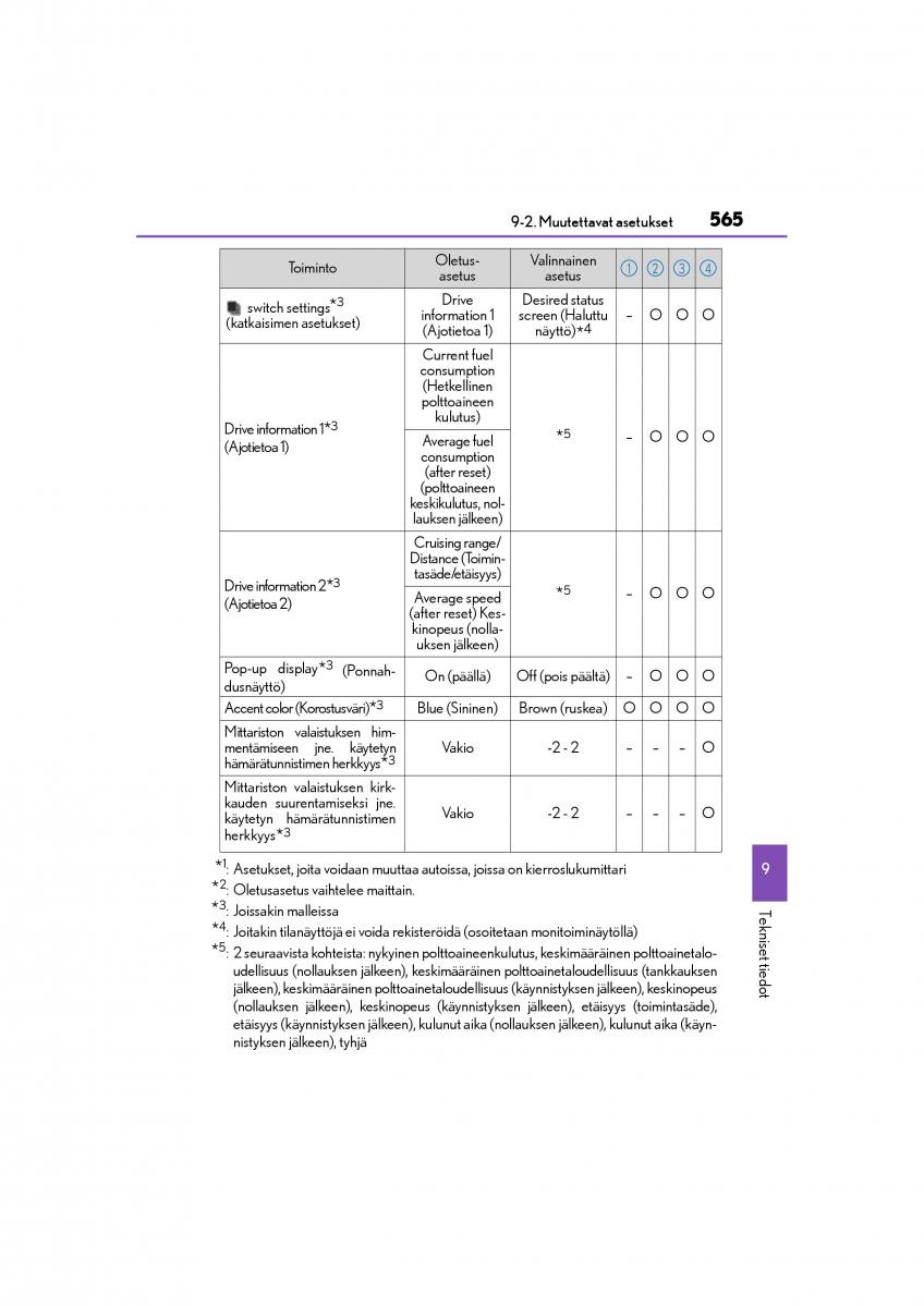 *: Asetukset, joita voidaan muuttaa autoissa, joissa on kierroslukumittari9