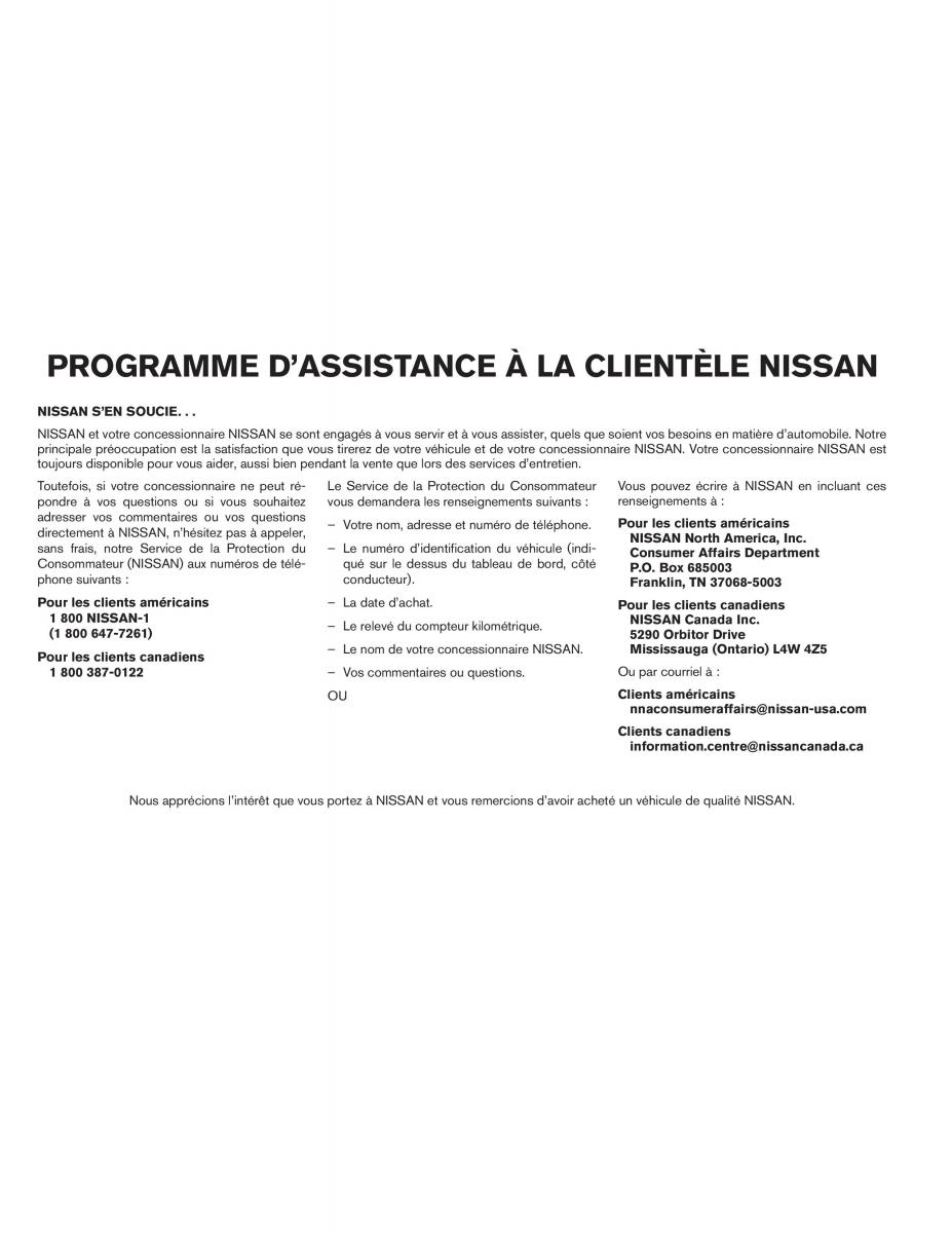 Toutefois, si votre concessionnaire ne peut ré-Le Service de la Protection du ConsommateurVous pouvez écrire à NISSAN en incluant ces