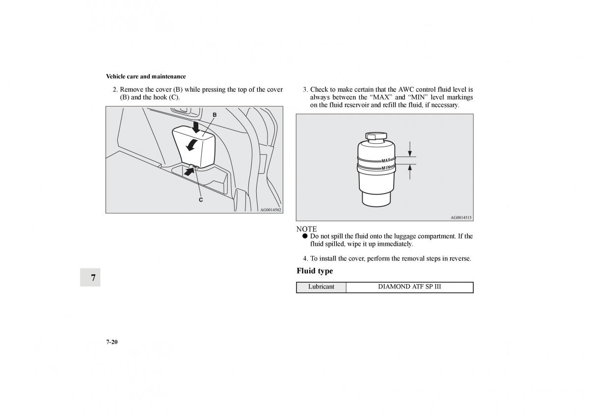 2. Remove the cover (B) while pressing the top of the cover3. Check to make certain that the AWC control fluid level is