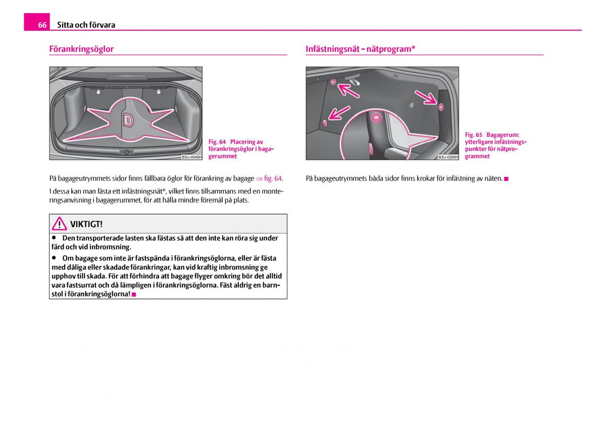 På bagageutrymmets sidor finns fällbara öglor för förankring av bagage ⇒ fig. 64.På bagageutrymmets båda sidor finns krokar för infästning av näten.