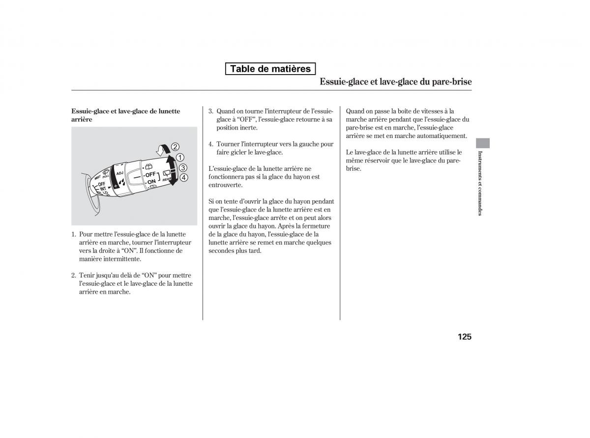 arrière glace à ‘‘OFF’’, l’essuie-glace retourne à sa marchearrière pendant que l’essuie-glace du