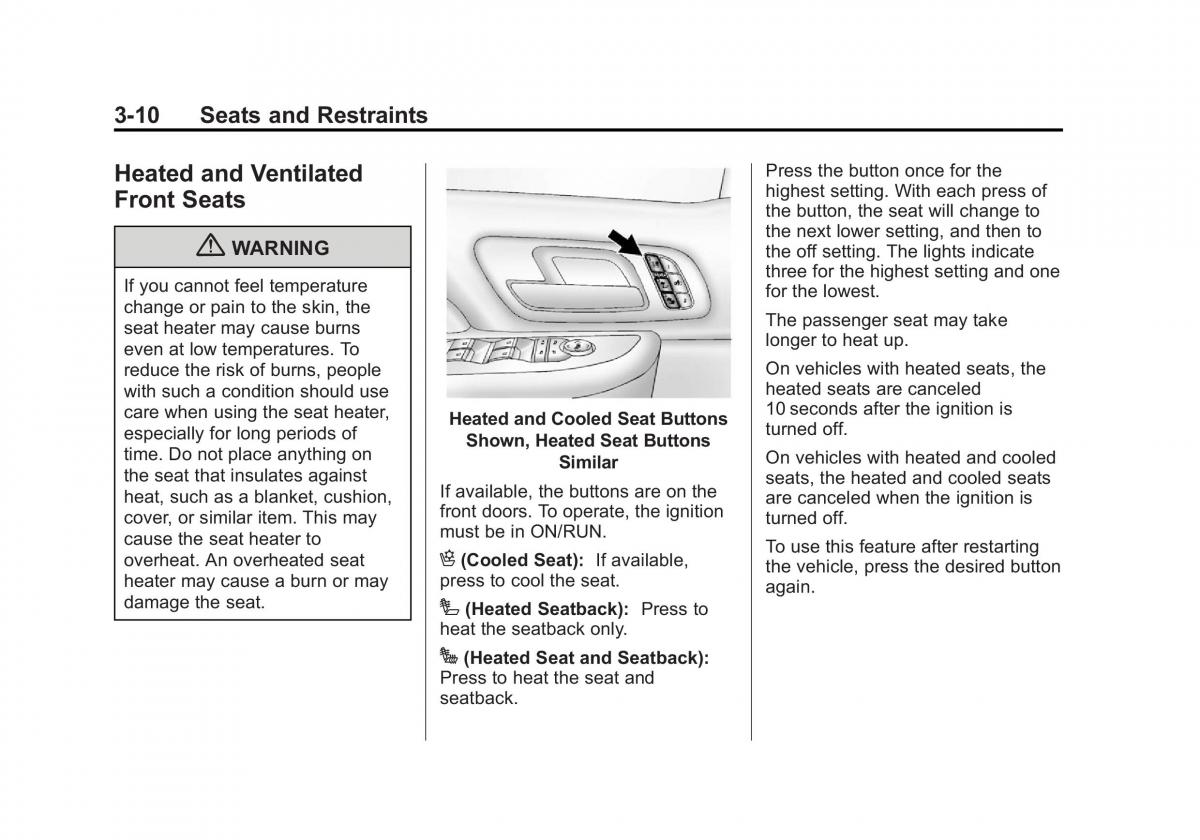 care when using the seat heater,Heated and Cooled Seat Buttons10seconds after the ignition is