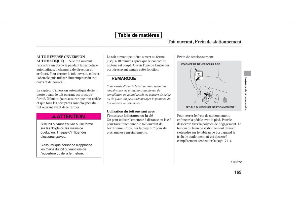 sur les doigts ou les mains de l’extérieure. Consulter la page 167pour de témoin du frein de stationnement devrait