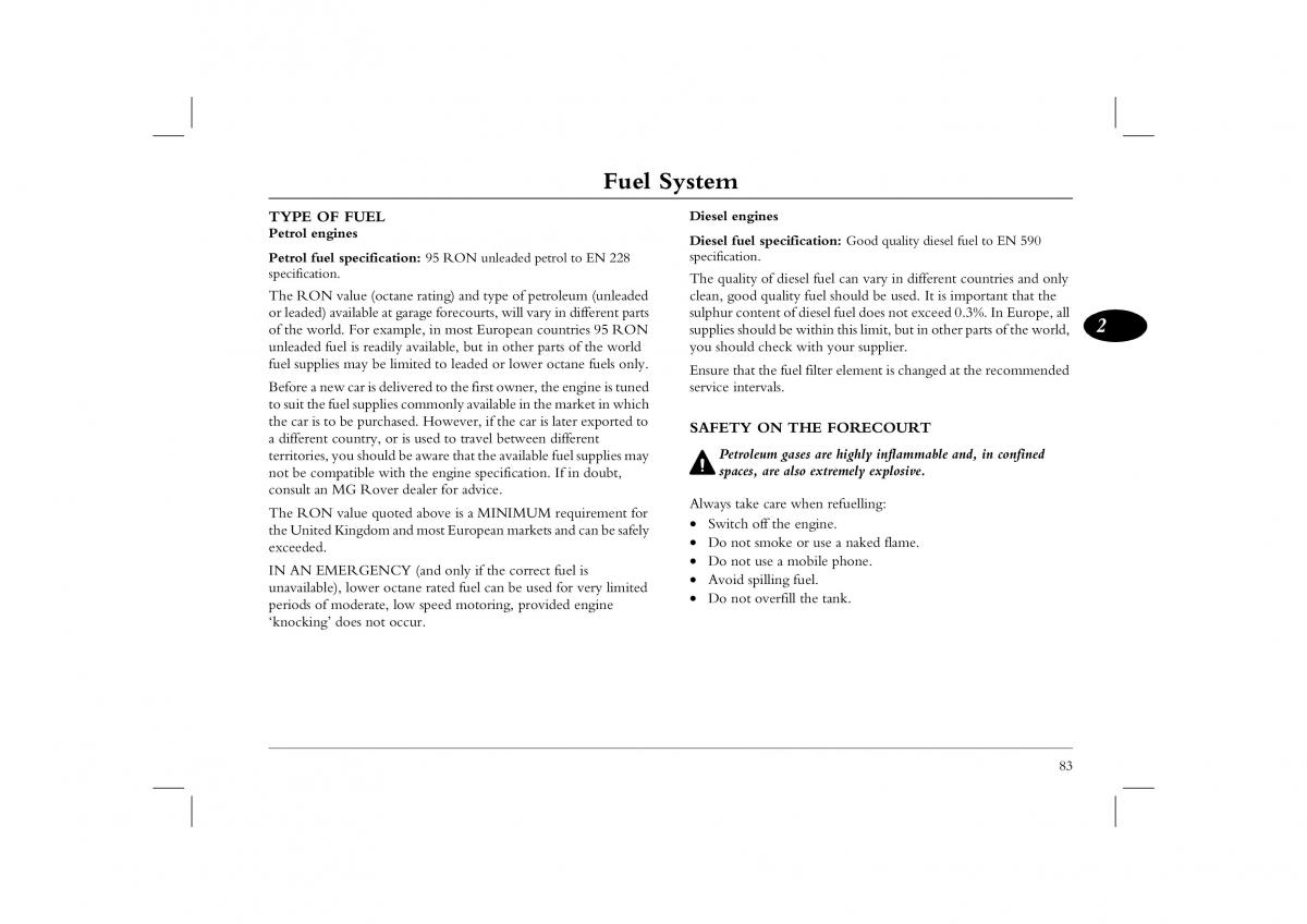 Petrol fuel specification: 95 RON unleaded petrol to EN 228 specification.