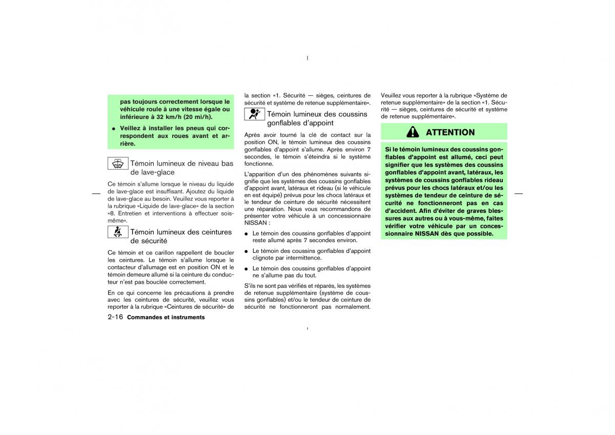 Témoin lumineux des ceintures Le témoin des coussins gonflables d’appointsionnaire NISSAN dès que possible.