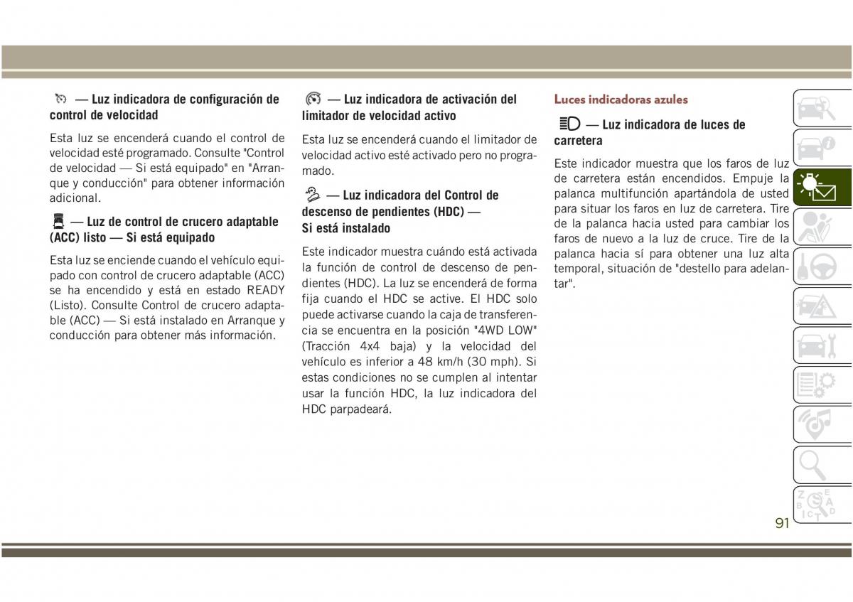 velocidadestéprogramado.Consulte"Controlvelocidadactivoestéactivadoperonoprogra-Este indicador muestra que los faros de luz