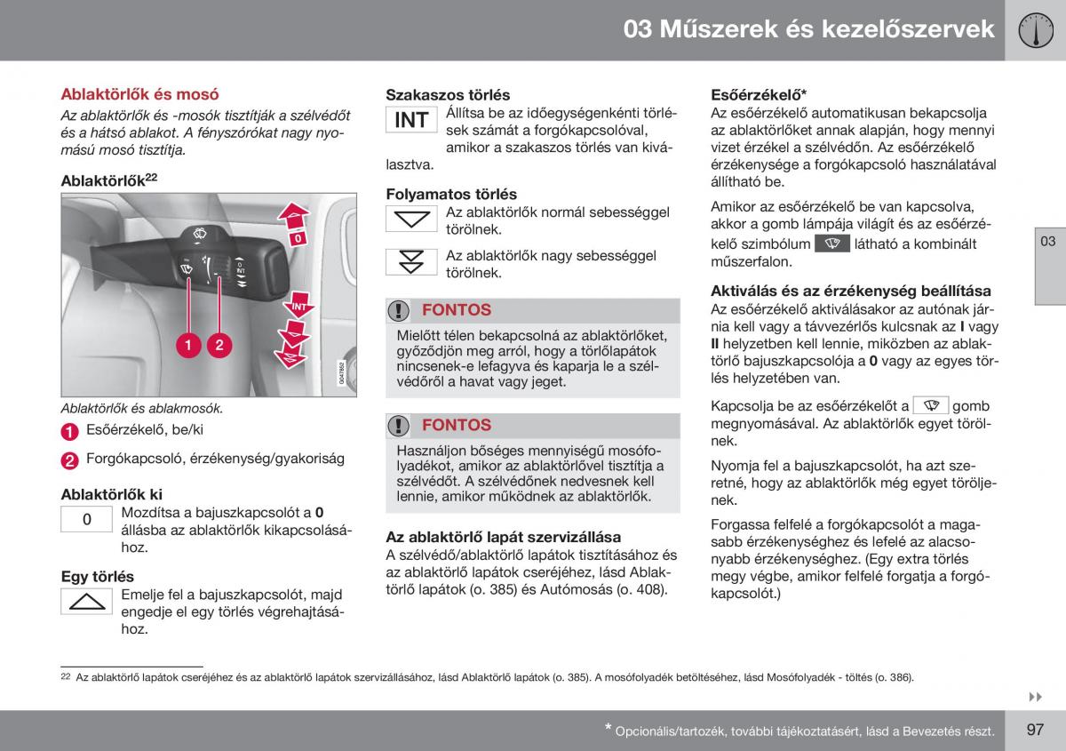 Az ablaktörlő lapátok cseréjéhez és az ablaktörlő lapátok szervizállásához, lásd Ablaktörlő lapátok (o. 385). A mosófolyadék betöltéséhez, lásd Mosófolyadék - töltés (o. 386).