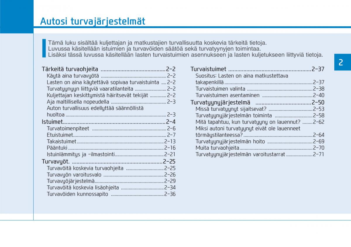 Luvussa käsitellään istuimien ja turvavöiden säätöä sekä turvatyynyjen toimintaa.